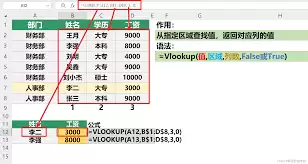 函数的语法结构是:VLOOKUP(查找值, 查找范围, 返回列数, 精确匹配或近似匹配)。