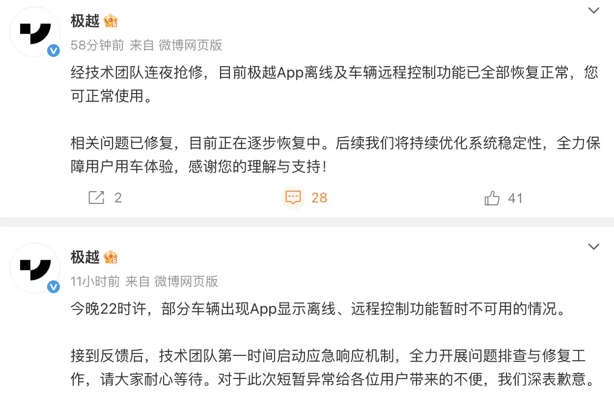 次日早上9点,极越汽车发布最新进展公告,表示经过连夜抢修,App离线及远程控制功能已全面恢复正常,用户可正常使用相关服务。官方同时承诺将持续优化系统稳定性,避免类似问题再次发生。这并非该品牌首次遭遇此类故障——今年7月,部分车主曾反映车辆App离线导致蓝牙钥匙失效,当时CEO夏一平公开致歉并称问题已紧急修复。