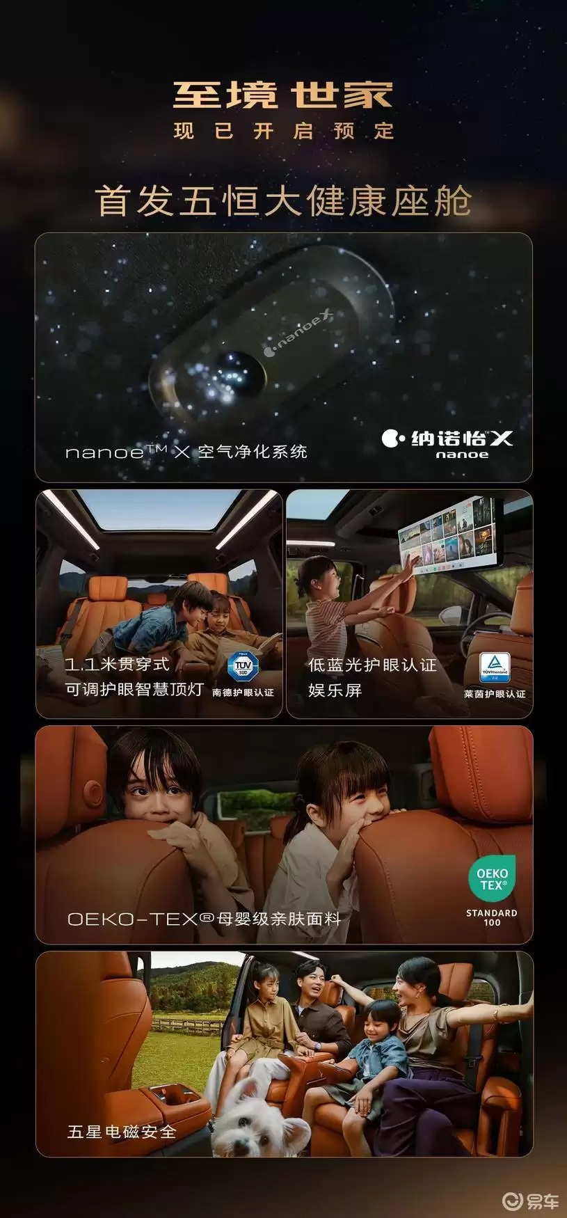 至境世家在智能交互方面同样令人惊艳。荣获南德TÜV认证的智慧顶灯提供无频闪柔光照明,三块大屏(含后排4K屏)均通过莱茵低蓝光认证,即使长途观影也能保护视力。座椅面料采用婴儿级亲肤材质,配合手势控制的电滑门设计,为全家出行带来安心便捷的体验。全车电磁辐射水平低于手机,真正打造出母婴级安全座舱。