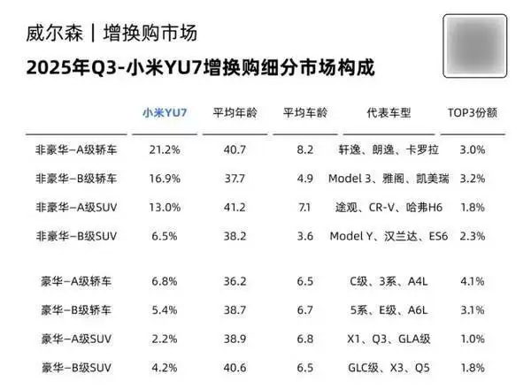 在用户画像方面,SU7与YU7的增换购群体呈现出明显差异。SU7的增换购车主多为40岁以上、旧车使用超过8年的"被动升级群体",他们对车辆的续航能力和后期维护成本较为关注。相比之下,YU7的增换购用户更为年轻,B级轿车和SUV用户的平均年龄分别为37.7岁和38.2岁,旧车车龄仅4.9年和3.6年,属于"主动升级群体"。这部分用户更愿意尝试先进的智能配置,如激光雷达和P-HUD等。