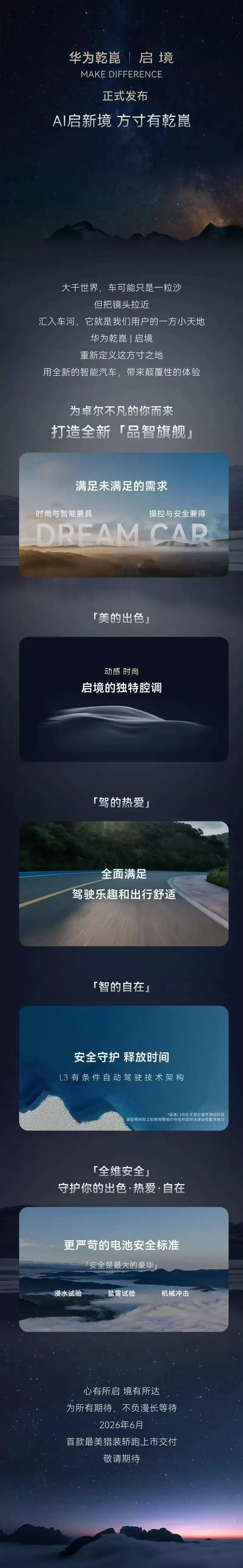 启境携华为乾崑发力,新款猎装轿跑2026年6月开启智能出行