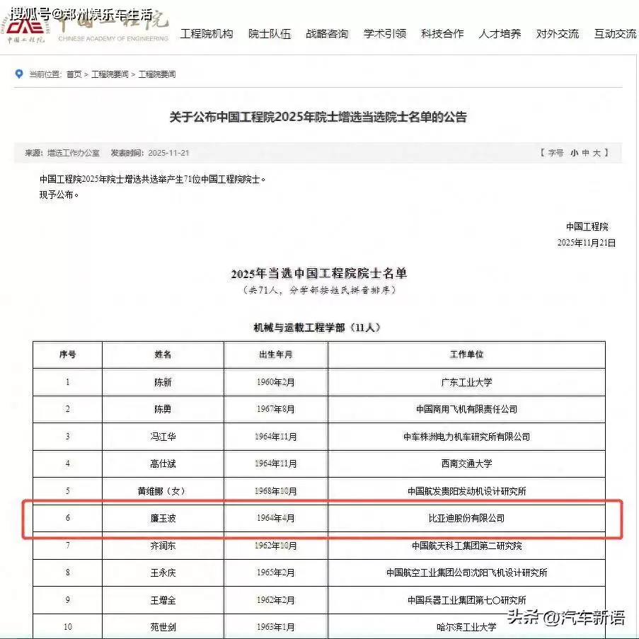 此次当选中国工程学院院士,廉玉波成为继多位行业前辈之后,新能源车领域又一位获此殊荣的科技工作者。中国工程学院院士是我国工程科技界的最高学术称号,获得者需在重大工程技术创新、关键核心技术攻关等方面作出系统性、创造性贡献。廉玉波的入选,体现了国家对新能源车产业技术创新体系建设的战略支持,也印证了比亚迪"技术为王,创新为本"发展理念的实践成效。