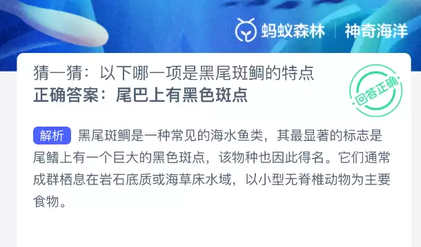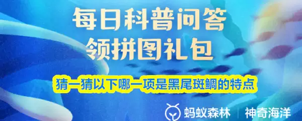 猜猜看:下面哪个特征是黑尾斑鲻鱼的典型标志?【神奇海洋】11月24日新题目已开启!正确答案现已公布,点击领取拼图,一起为修复海洋生态贡献力量!今天的正确答案是:【尾巴上有黑色斑点】。黑尾斑鲻是一种常见的海水鱼类,其最醒目的标志就是尾鳍上有一个巨大的黑色斑点,该物种也因此得名。