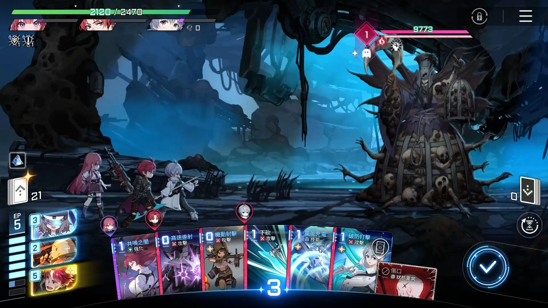 蓝瓶的战斗分为两个主要阶段:召唤阶段与本体阶段,战斗节奏较快且容错率低,需要合理安排卡牌使用顺序。战斗初期,boss会召唤三只小怪协同作战。这些小怪虽然单体输出不高,但会持续施加干扰性伤害,拖延我方输出节奏,如果不及时清除,累积的伤害将严重影响队伍的生存能力。建议优先使用具备群体伤害效果的AOE卡牌进行清场,快速结束第一阶段。同时注意控制能量消耗,为后续对战boss本体保留足够资源。
