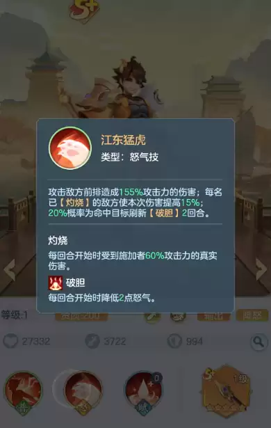 另外他在怒气技能方面除了攻击敌方之外,还可以根据前排目标来造成155%伤害。之后对已受灼烧状态影响的敌人进行伤害提升,提升数值为15%。在达到伤害提升能力之后,还有20%概率触发一个破弹的状态加成。此时只要是他命中的目标被增加了破弹的话,后期还可以降低这个敌人身上的怒气数据。因此利用这个技能可以影响敌人释放怒气技能效果。在这里根据天赋技能来判定的话,孙策达到传说1星就可以激活虎魂效果。