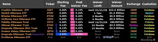 - Grayscale以太坊现货迷你ETF:代号ETH、费用为0.25%(前20亿美元或前12个月为0.12%)