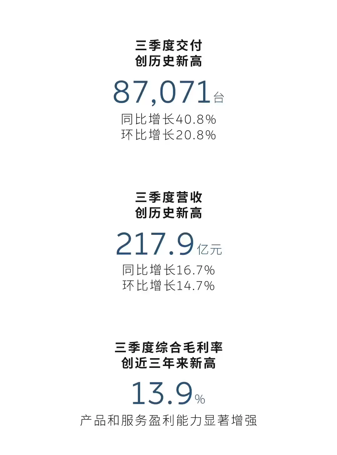 11月25日,蔚来汽车发布了2025年第三季度财报。该公司在本季度共交付车辆87,071台,不仅较去年同期大幅增长40.8%,较上季度也提升了20.8%,创下历史交付新纪录。第三季度总收入达217.9亿元,同比增幅为16.7%,环比增长14.7%,同样刷新了历史最高营收水平。
