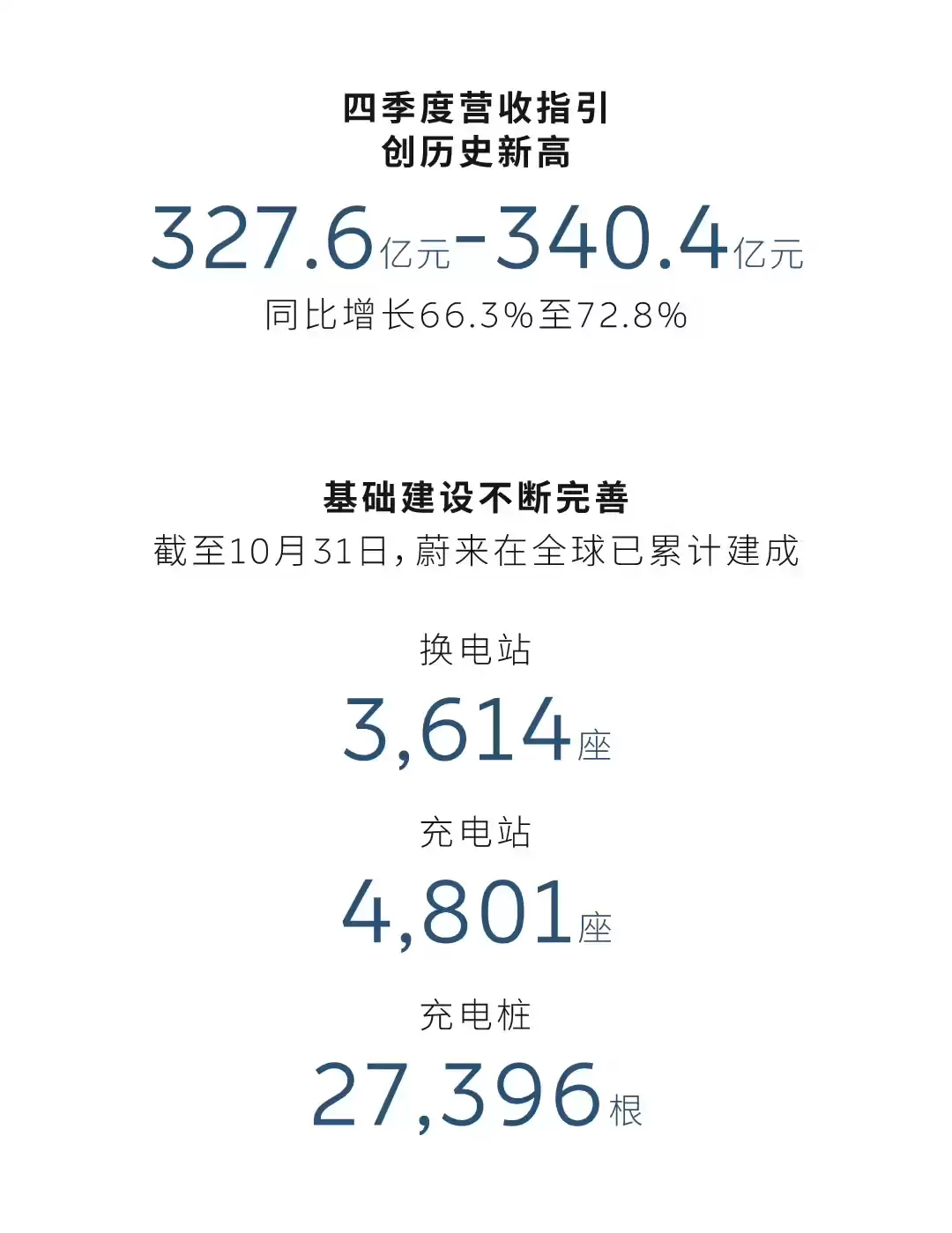 对于第四季度,蔚来预计交付量将在12万至12.5万台之间,同比增长65.1%至72.0%,有望再次刷新历史纪录。营收指引范围为327.6亿元至340.4亿元,同比增幅预计达66.3%至72.8%,也将创下历史新高。