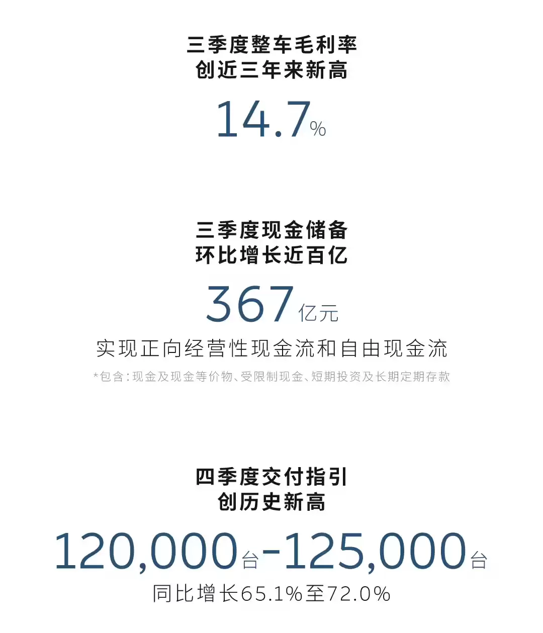 本季度综合毛利率回升至13.9%,创下近三年新高,充分反映了产品与服务盈利能力的显著提升。整车毛利率达到14.7%,也创下近三年最好表现。截至季度末,公司现金储备增至367亿元,较上季度净增近百亿元,经营活动现金流与自由现金流双双转正。