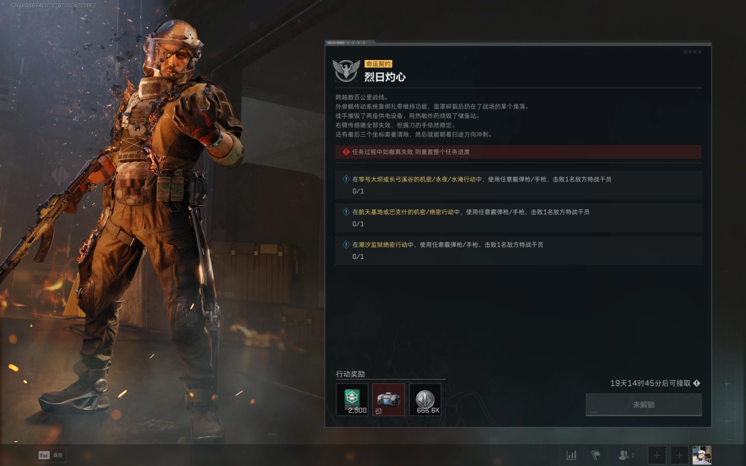 2、在航天基地或巴克什的机密/绝密行动中,使用任意霰弹枪/手枪,成功击倒1名敌方特战干员