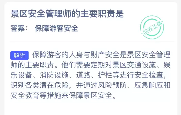 您是否好奇景区安全管理师的主要职责是什么?【蚂蚁新村每日一题】2025年11月25日题目已公布!坚持答题,积攒木兰币,就能加速推进小镇建设。答对本题,马上享受“产速+3/时”的加速奖励!今日正确答案是【保障游客安全】。保障游客的人身和财产安全,正是景区安全管理师的首要职责。