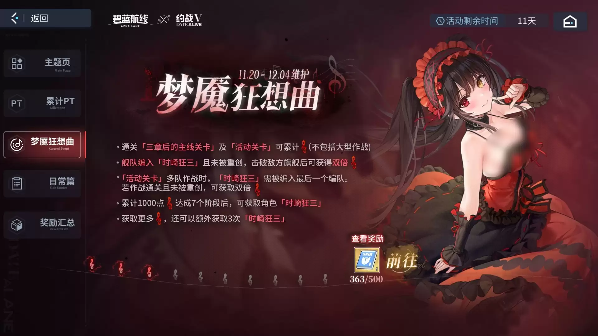 本次约战联动从11月20日持续到12月4日(2025年),时间相当充裕。玩家在活动中总共可以获取六位联动角色,而且她们全都是实力不俗的金皮舰船。其中,夜刀神十香(重巡)、鸢一折纸(航母)以及五河琴理(战列)需要通过消耗魔方进行建造获取;时崎狂三(轻巡)则能通过战斗累计梦魔音符来兑换;四系乃(轻航)是PT累计奖励;双子金船八舞耶俱矢·八舞夕弦(轻巡)既可以通过建造获得,也能在活动商店用PT兑换,甚至在活动关卡第六关打捞也有可能掉落,获取途径十分多样。