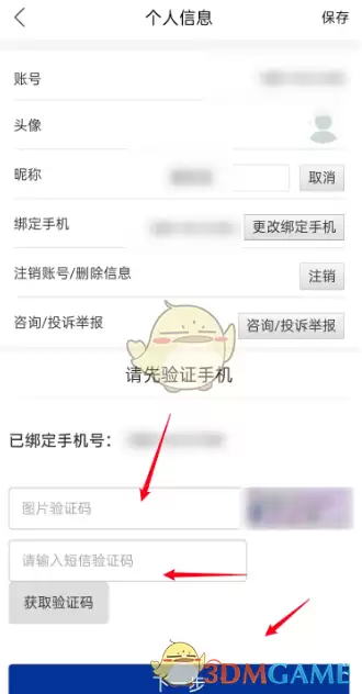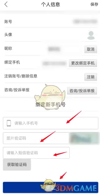 4、进入新界面后,输入需要绑定的新手机号码,获取并填写验证码,最后点击绑定按钮,即可完成手机号的更换。