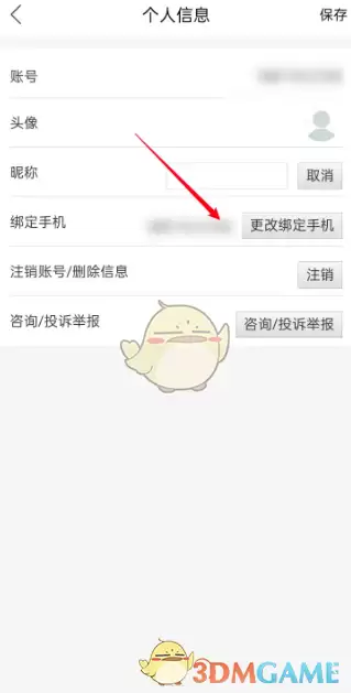 2、进入个人信息菜单栏后,找到并点击“更改绑定手机”功能按钮。