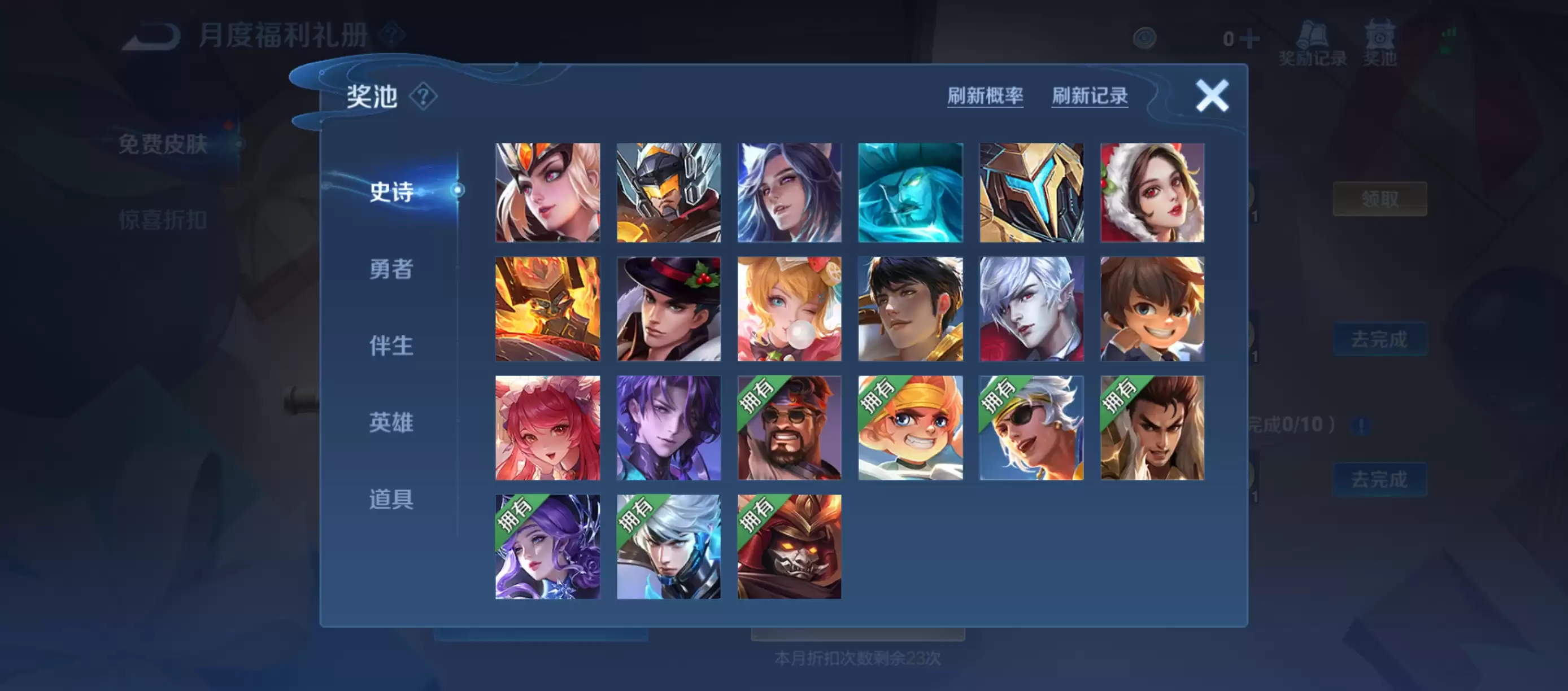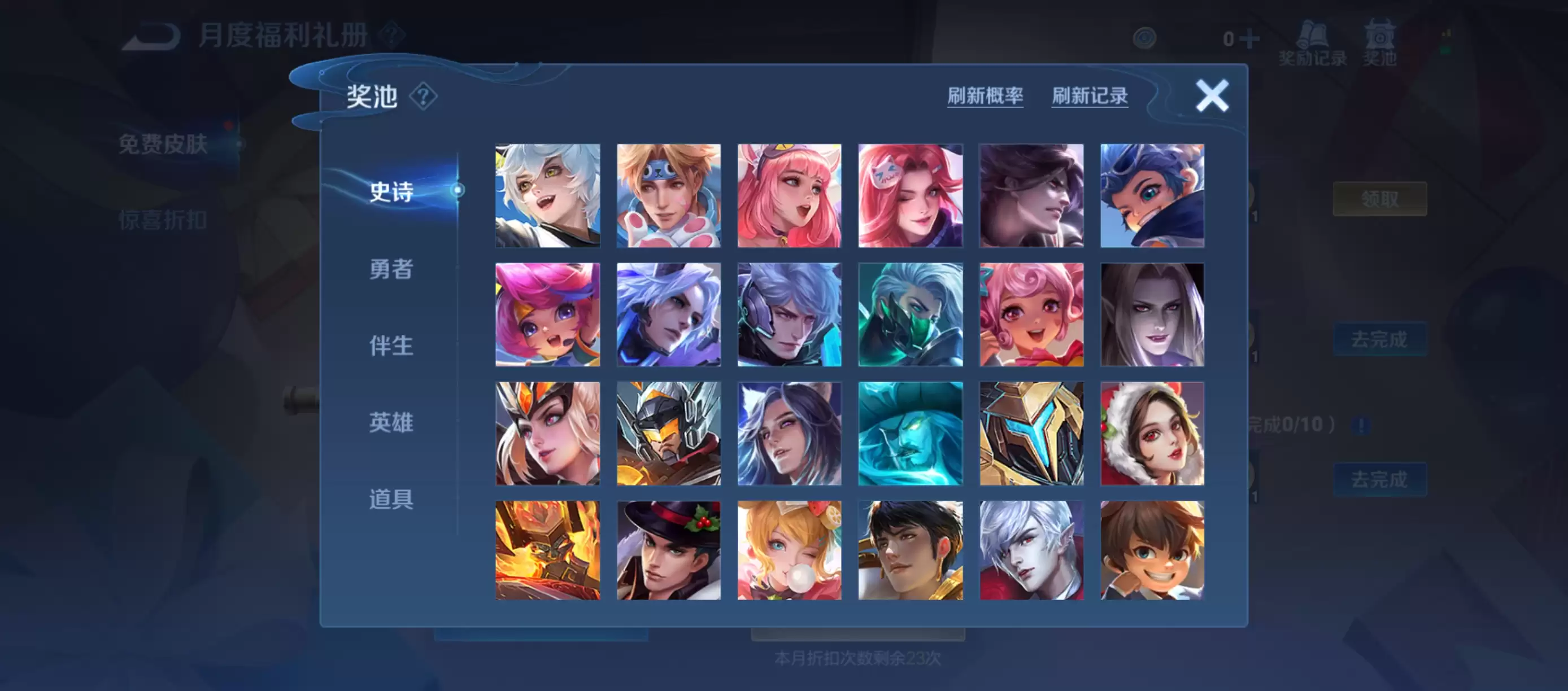 保底机制对玩家来说也十分实在,累计刷新120次即可获得此前未曾拥有的史诗皮肤,福利力度相当不错。此外,如果刷到已经拥有的勇者皮肤也无需沮丧,系统会自动将其替换为4张积分夺宝抵用券,可以积少成多。说不定用抵用券就有机会拿到荣耀水晶。这里还有一个时间点需要记住:10月份活动已在10月31日正式结束。刷新次数虽然可以跨越继承,但货币不会保留。