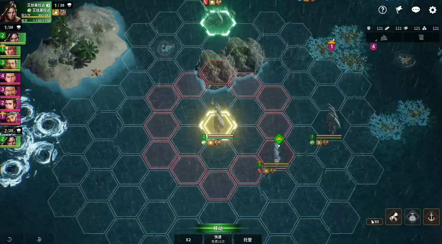 战斗正式开始后,系统会将你带入专属的战斗地图,这里就是与敌舰对决的舞台。这个区域采用六边形网格设计,舰队和敌舰会分别占据不同位置,展开回合制的较量。每个回合的顺序是根据舰队的机动能力决定的,你可以在画面上方看到行动顺序。过程中,船员们的特殊能力会自动触发,相同效果的船员数量越多,能力加成就越显著。你可以通过菜单详细查看这些能力效果,从而制定更有效的制胜策略。