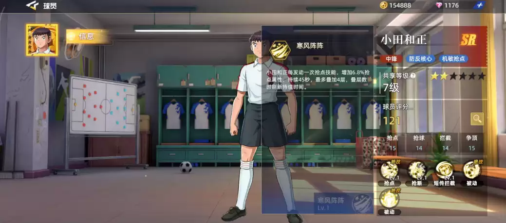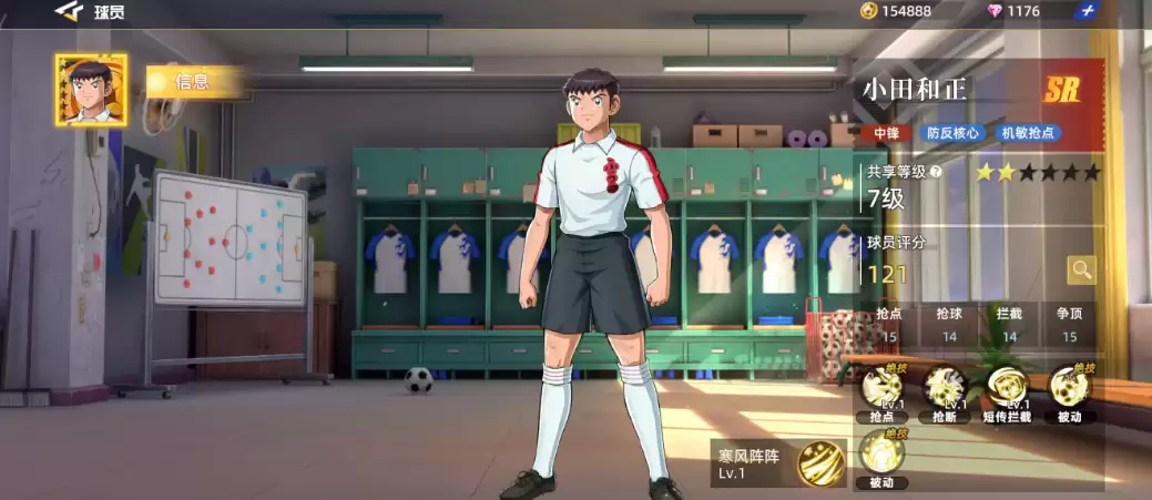 作为初始即可获得的SR级球员之一,小田和正拥有明确的场上定位——中锋。他的技能体系特别适合采取防守反击的战术打法,不仅机动性强,反应也十分灵敏。基础评分为121分,在同品质球员中处于中上水准。其关键属性如抢点15、抢球14、拦截14、争顶15,展现出他在空中对抗和防守落点控制方面的明显优势。不过在六维图中抢球数值相对偏低,仅为14,因此实战中应尽量避免直接拼抢,转而发挥他在其他维度上的均衡能力。