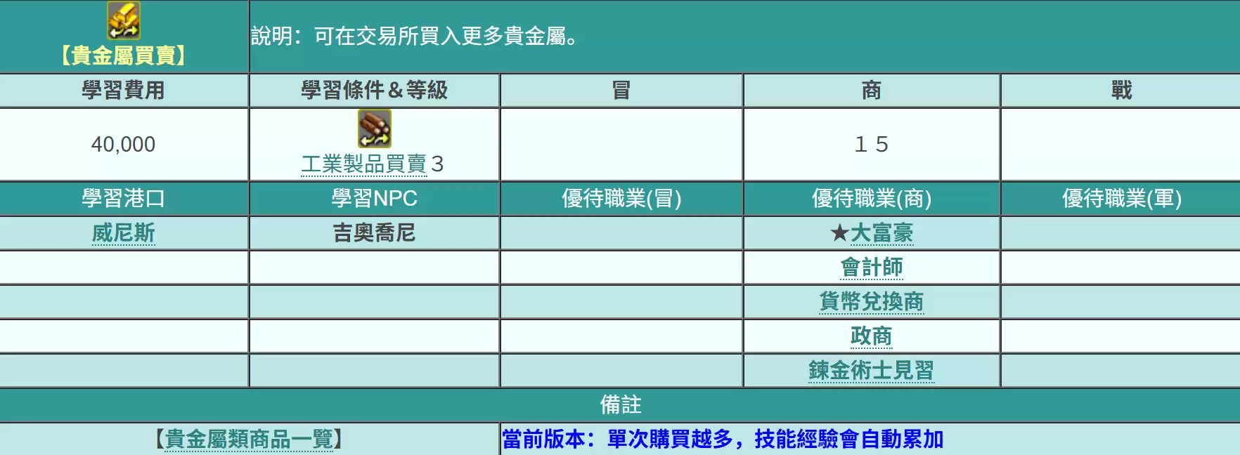贵金属的获取途径并不仅限于港口交易,在一些支线任务和冒险探索中也有机会获得。想要快速提升贵金属交易技能等级的话,可以多参与港口建设、区域投资等系统,因为区域等级越高,能够出售的贵金属种类和数量上限就越多。此外,玩家还可以使用交易增益道具来提高贸易过程中的利润系数,这类道具在贵金属类货物上效果尤其显著,也能加快资金周转。