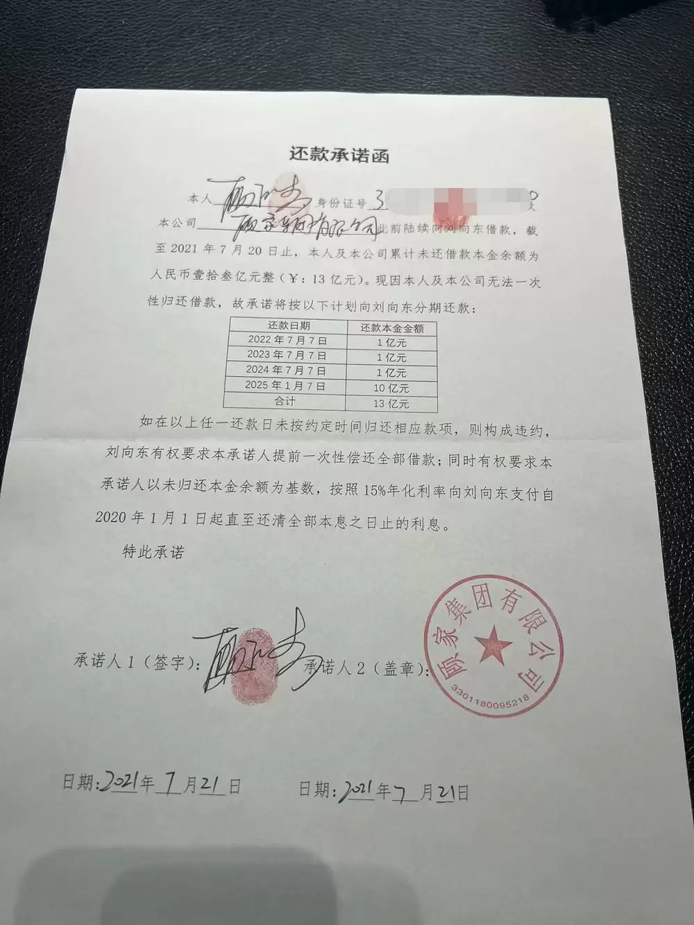 除资产转移指控外,代明贸易还提供文件称,顾江生多年来持续向民间放贷人刘向东举债。一份2024年签署的承诺书显示,当年借款余额约13亿元,偿付期至2025年。