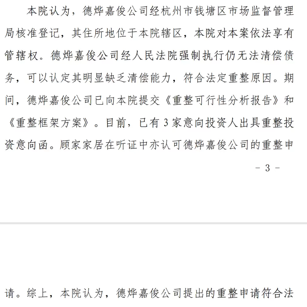 法院指出,顾家集团在多个被执行案件中多次因“无可供执行财产”而被终结执行,符合法定重整条件。目前已有三家机构提交重整投资意向函。顾家家居未对重整申请提出异议。