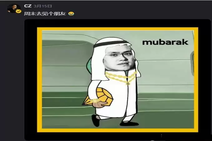 真正的爆点来自3月15日早上8点。CZ在币安广场发了一张把自己头像P到Mubarak形象上的迷因图,配文“周末去见个朋友”。
