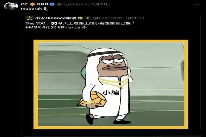 整个事件的引爆点始于3月12日。当天,阿联酋主权基金MGX宣布投资币安的消息刷屏后,币安华语推特账号发布了一张“小编”身穿阿拉伯长袍的恶搞图。