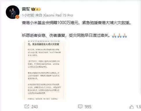 小米基金会捐赠千万港元,支援香港大埔火灾救援