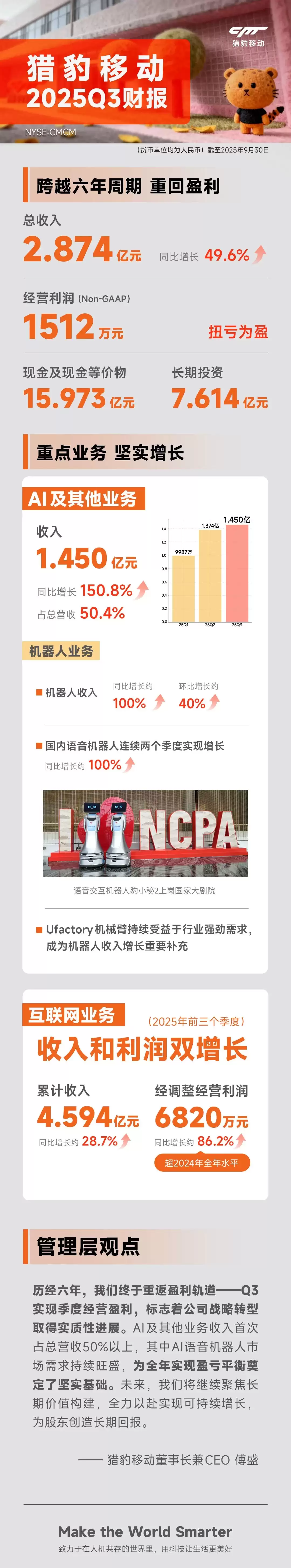 公司管理层在财报中强调,经过六年战略调整,猎豹移动已重回盈利轨道。董事长傅盛指出,AI语音机器人市场需求持续释放,不仅推动业务占比突破五成,更为全年经营目标达成奠定基础。当前公司正加速构建“AI+硬件+服务”的生态体系,通过垂直场景的深度渗透,持续巩固在智能服务机器人领域的领先地位。
