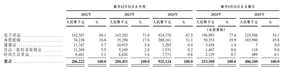 羊小咩2025年前五个月来自电子产品的收入为2.2亿元,占比54.1%;珠宝配饰类收入为1.86亿元,占比45.8%。