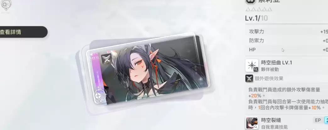 第二款推荐的是索利亚的时空扭曲,这个专武的效果也相当出色,属于游侠职业的专属装备。该武器能够在战斗中对敌方造成额外20%的伤害,尤其契合当前版本的输出型C位角色,常与雨果搭配使用,整体表现十分突出。此外,在一回合内对卡牌伤害量还可再提升10%,能打出相当不错的回合输出。