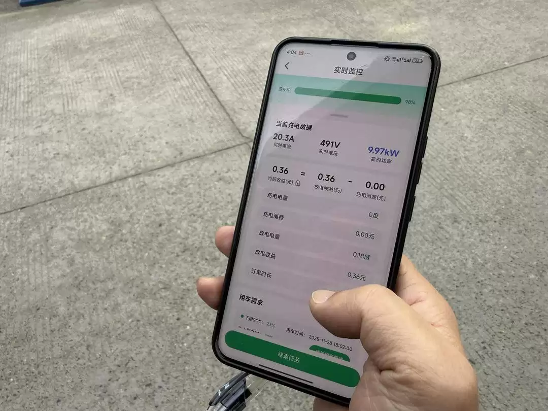 11月28日下午4时许,成都高新区府城大道西段的一处充电站内,车主许文韬正通过手机APP操作放电流程。他将充电枪接入车辆交互接口,扫描设备上的二维码后,系统立即开始记录实时放电数据。"目前已经放电10度,赚了将近20元。"他展示的手机界面清晰显示着放电量、实时收益及电价等信息。许文韬透露,前晚他刚以每度0.2元的低价在家中完成充电,而当前放电价格高达每度2元,"这个补贴力度的确很有吸引力"。