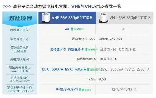 针对这一行业痛点,永銘电子推出了全新VHE系列高分子混合动力铝电解电容器,通过材料与工艺的双重创新实现了性能突破。该系列在继承VHU系列优势的基础上,采用高分子聚合物与电解液复合技术,使电容在高温环境下的稳定性与耐久性显著提升。实测数据显示,VHE系列在135℃高温下寿命可达4000小时,并支持150℃极端温度应用,能够完全覆盖引擎舱内最严苛的工作场景。