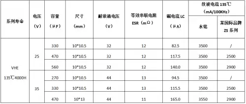 通过35V+330μF+10*10.5规格产品的对比测试,VHE系列在耐压、ESR、漏电流密度等关键参数上均优于前代。其独特的耐过载设计可承受突发冲击工况,卓越的充放电循环性能使其在频繁启停场景下寿命延长50%以上。这些特性使其成为电子水/油泵控制器、冷却风扇驱动电路等高温应用场景的理想选择。