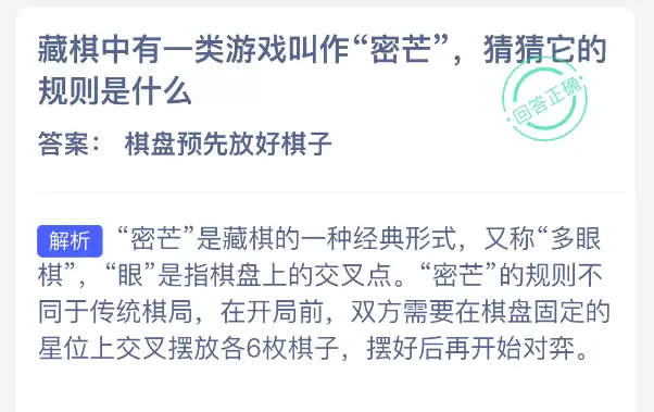 在藏棋中,有一类独特的游戏被称为"密芒",你知道它的玩法规则吗?【蚂蚁新村每日一题】2025年11月28日题目已公布!每天坚持答题,累积木兰币,就能加速小镇的建设进度。答对今天的题目,还能立即获得"产速+3/时"的加速奖励哦!今日正确答案是【棋盘预先放好棋子】。"密芒"的规则与传统围棋截然不同,对局开始前,双方需要在棋盘固定的星位上交叉摆放各6枚棋子,完成布局后再展开正式对弈。