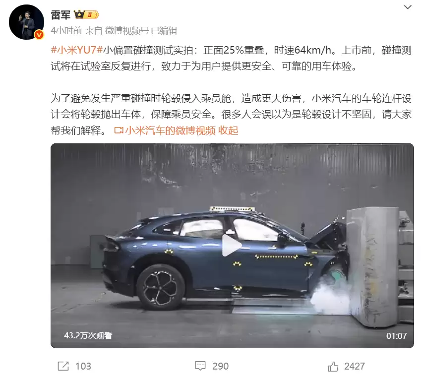 针对近期网络流传的安全质疑,雷军同步展开技术解密。他公布了小米YU7的小偏置碰撞测试细节:在正面对25%重叠、64km/h时速的严苛条件下,车辆通过特殊设计的车轮连杆结构,使轮毂在碰撞时脱离车体,避免侵入乘员舱。这项被误读为“轮毂不坚固”的设计,实则是为提升碰撞安全性的创新方案。此前雷军曾多次展示SU7的研发标准,包括51,000Nm/deg的整车扭转刚度及全球三大安全认证。
