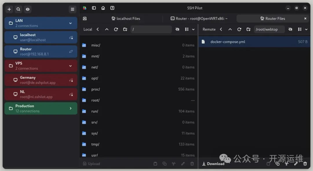 不需要另外打开 SFTP 客户端,直接在 SSH Pilot 里就能浏览远程文件,拖拽就能上传下载,还支持多选操作。这个功能特别适合快速修改配置文件或者传输日志文件。