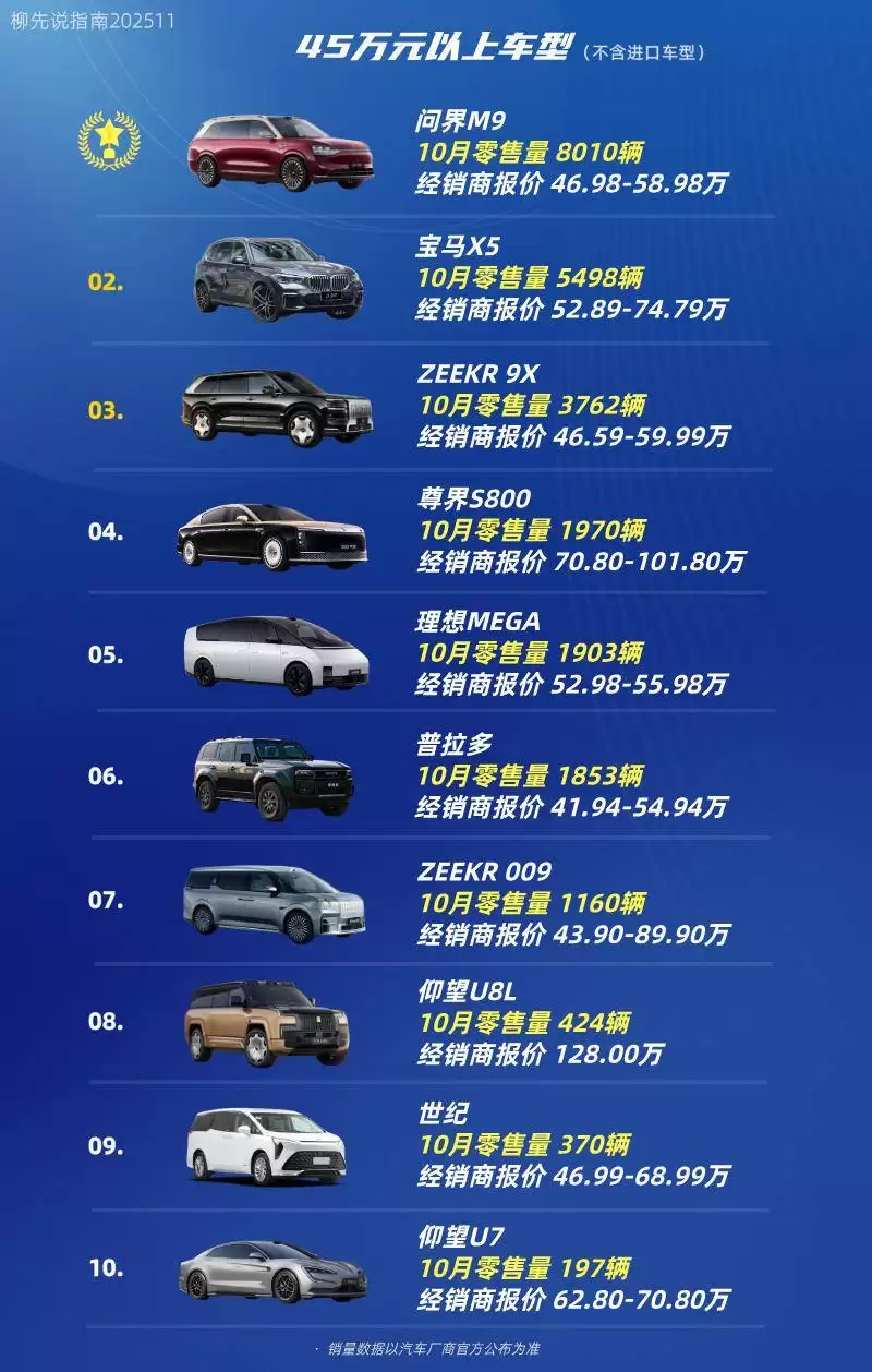 2025年45万以上高端车市:问界M9月销破8000领跑,自主品牌崛起