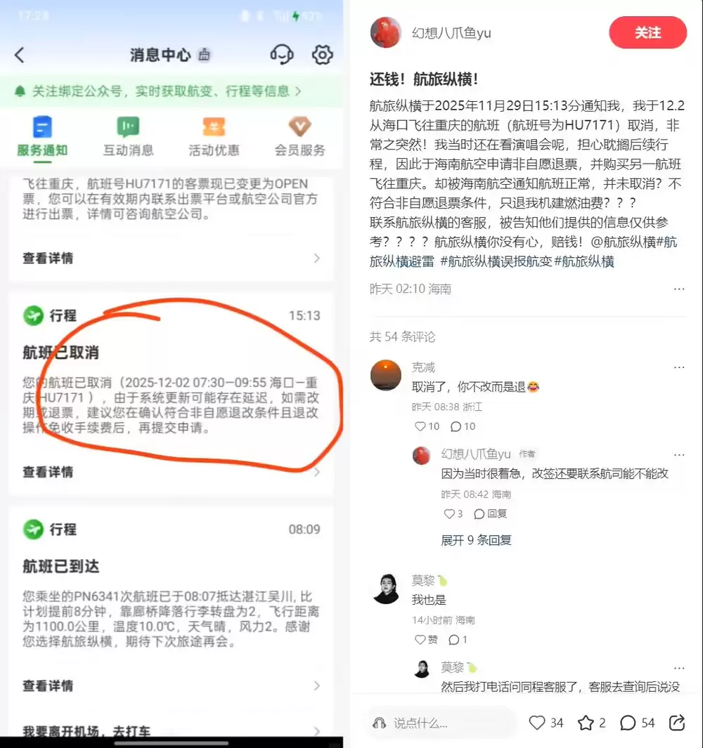 12月1日消息,据广州广播电视台报道,多位网友近日反映,在11月29日下午3点左右,收到了来自航旅纵横平台的航班取消提醒。部分乘客在重新购票后才发现,实际航班并未变动,而是航旅纵横系统出现故障,错误推送了消息,导致不少旅客额外承担了机票差价和退票手续费。