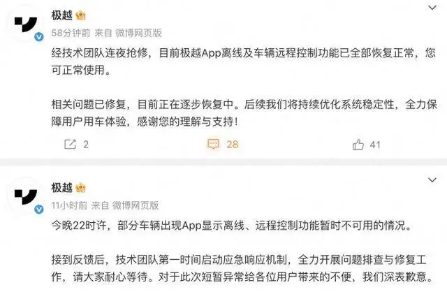 次日上午,极越汽车发布更新声明,称经过连夜抢修,应用程序及相关远程控制功能已全面恢复,用户可正常使用各项服务。公司同时承诺将持续优化系统稳定性,以提升车主用车体验。值得注意的是,这已非极越首次遭遇类似故障。今年7月,部分车主也曾反映应用程序出现离线、远程功能异常等情况,当时CEO夏一平公开致歉,并表示问题已得到紧急修复。