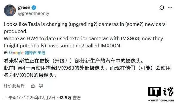 值得注意的是,此次摄像头升级并非孤立事件。结合马斯克此前透露的AI5部署计划,以及特斯拉在自动驾驶领域持续加码的研发投入,外界普遍认为这标志着公司正加速推进完全自动驾驶技术的商业化进程。虽然新型传感器IMX00N的具体性能参数尚未公开,但技术社区普遍预期其将在分辨率、帧率或低光表现等关键指标上实现突破。
