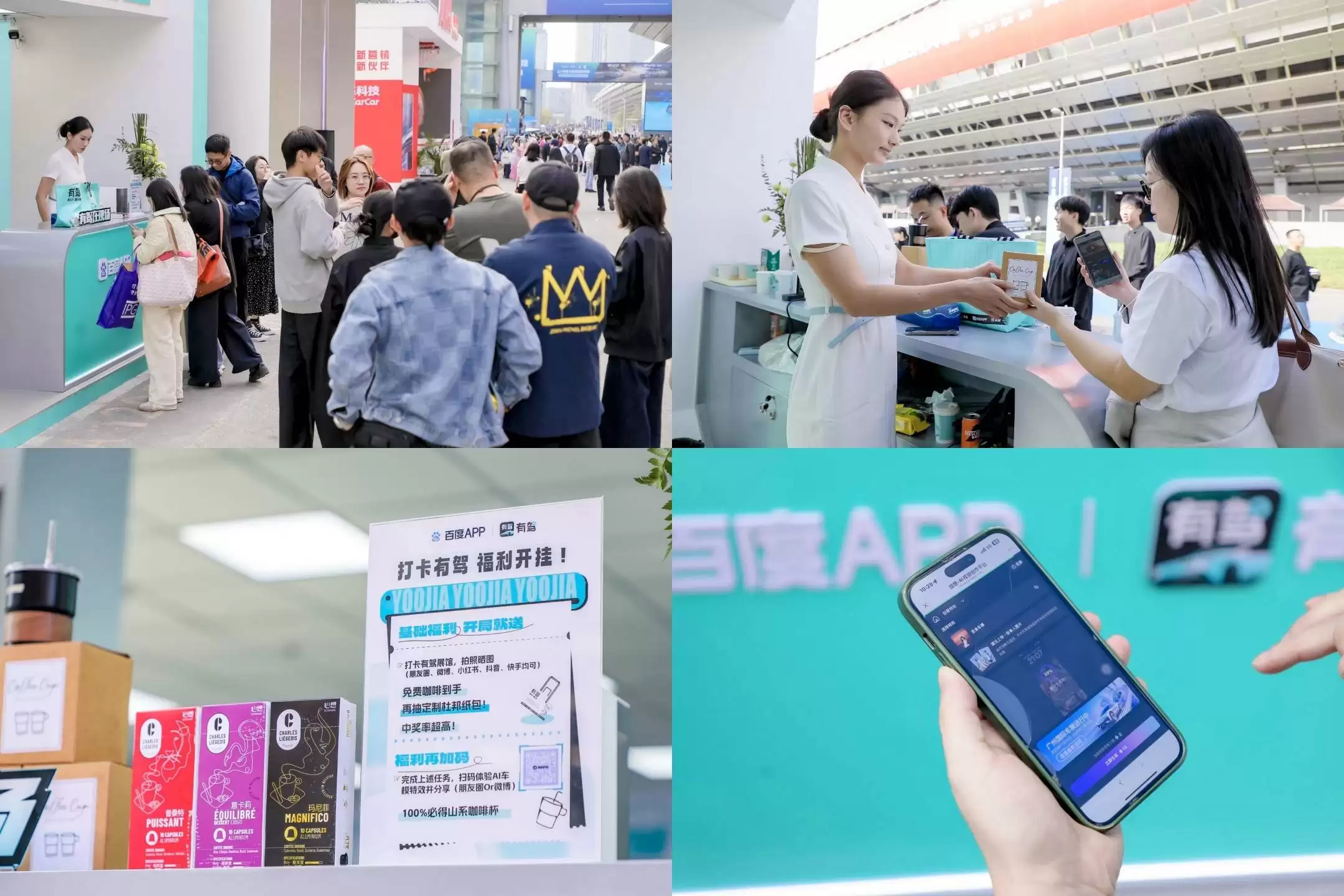 线下体验方面,百度有驾在车展公众日推出创新互动活动,将科技与趣味巧妙结合,吸引大量观众踊跃参与。其展台设置的“刮刮乐”打卡任务,通过完成指定动作即可赢取定制咖啡与周边礼品,其中最受欢迎的当属“化身车模”AI特效体验。用户上传照片后,系统可生成其在赛博场景中化身车模的动态视频,并支持一键分享至社交平台。这一活动不仅为观众带来个性化乐趣,更通过社交传播为车展增添话题热度,形成线上线下联动的传播效应。