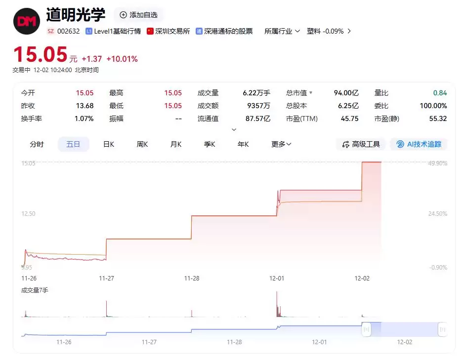 另一方面,行业的变革也为相关企业带来了新的发展机遇。AI 手机的出现,打破了传统手机行业的竞争格局,为那些在 AI 技术领域有布局、有创新的企业提供了弯道超车的机会。像道明光学这样的企业,凭借在 AI 手机散热材料等关键领域的技术优势,成为了市场资金追捧的对象 。此外,资金的推动也是龙头 4 连板的重要因素。在当前市场环境下,资金需要寻找新的投资热点,AI 手机概念正好符合这一需求。大量资金的集中买入,使得道明光学等龙头股的股价在短期内快速上涨。