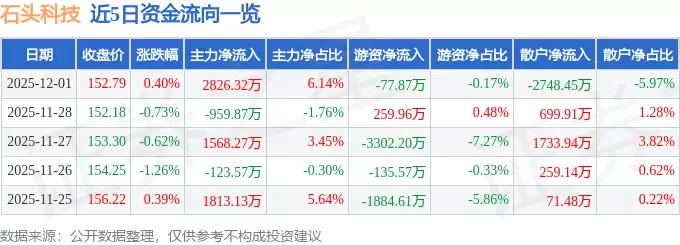 石头科技(688169)最新交易日收盘报152.79元,较前一日微涨0.4%。当日市场交投活跃,换手率达1.17%,成交量为3.03万手,总成交额突破4.6亿元。资金流向数据显示,主力资金呈现净流入态势,全天净流入金额达2826.32万元,占总成交额的6.14%;游资资金则小幅净流出77.87万元,占比为0.17%;散户资金净流出规模较大,达到2748.45万元,占总成交额的5.97%。