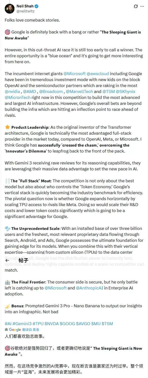 Counterpoint Research的分析师兼联合创始人尼尔·沙阿(Neil Shah)一语中的:“谷歌无疑一直就是这场AI竞赛中的黑马。它是一个沉睡的巨人,现在完全苏醒了!”