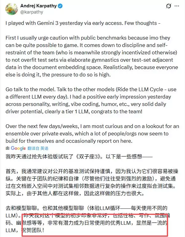 甚至连OpenAI的创始成员之一安德烈·卡帕西(Andrej Karpathy)都忍不住“点赞”,称Gemini 3“显然是第一梯队的大语言模型”!