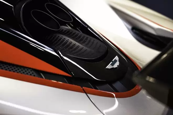 车尾方面,阿斯顿·马丁Valhalla量产版摒弃了固定翼设计,配备超大尺寸扰流板,其角度也可随车速调整,类似于F1赛车开启“DRS”的原理,在车速达到240公里/小时时,可产生超过600公斤的下压力,随着车速提升至最高时速350公里/小时,主动空气动力学系统会逐步降低前后翼的“迎角”,“释放”多余的下压力,以维持下压力水平,最大限度地增强驾驶员的信心。同时,新车采用四出钛合金排气系统,一对排气管位于车顶,另一对排气管则位于车身底部通道两侧,其下置排气管由主动阀控制。