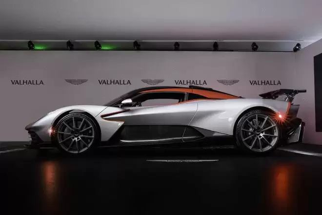 动力上,新车搭载由4.0升双涡轮增压V8发动机和前双电机、后单电机组成的插电式混动系统,系统综合功率1079马力,综合扭矩1100牛·米,匹配全新8速双离合变速箱(DCT)并集成电机和灵敏的液压驱动电子后限滑差速器(E-diff),百公里加速仅2.5秒,电子限速下的最高车速为350公里/小时。当然,凭借出色的动力系统,Valhalla还创下了众多“第一”的成就:阿斯顿·马丁有史以来第一款量产中置引擎超级跑车、第一款插电混动车型、第一款配备专用电动汽车续航能力的量产车。不仅如此,Valhalla还是第一款搭载定制版平面曲轴4.0升双涡轮增压V8发动机(阿斯顿·马丁有史以来性能最强悍的V8发动机)的车型。同时,它也是第一款采用阿斯顿·马丁全新8速双离合变速箱(DCT)并集成电机和灵敏的液压驱动电子后限滑差速器(E-diff)的车型。