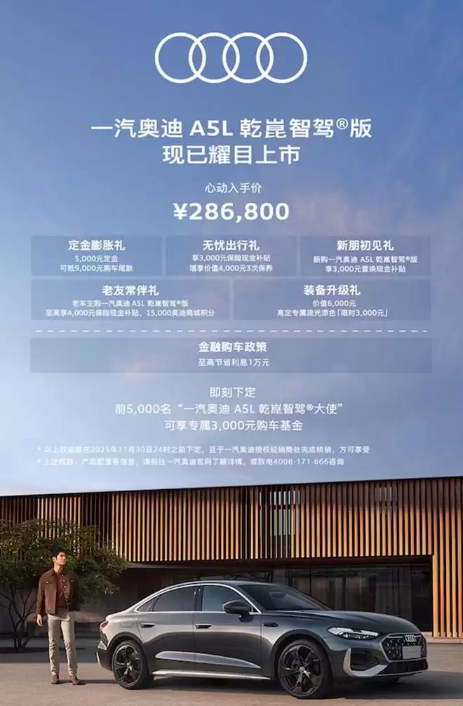最新同时公布多项专属订车权益:2025年11月30日24时之前下定立享五重专属礼遇——定金膨胀礼:5,000元定金抵9,000元购尾款;无忧出行礼:享3,000元保险现金补贴,增享价值4,000元3次保养;新朋初见礼:新购一汽奥迪 A5L乾崑智驾版享3,000元置换现金补贴;老友常伴礼:老车主购一汽奥迪 A5L乾崑智驾版至高享4,000元保险现金补贴;装备升级礼:限时3,000元可享价值6,000元高定专属流光漆色;一汽奥迪还为用户提供专属金融购车政策,至高节省利息1万元;此外,前5000名“一汽奥迪A5L乾崑智驾大使”可享专属3,000元购车基金礼遇。