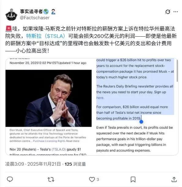 路透社称,本月初,股东们刚刚欢天喜地地批准了马斯克的新薪酬方案,却忽略了一个潜伏在暗处的巨大财务黑洞:那份悬而未决的2018年旧薪酬案。