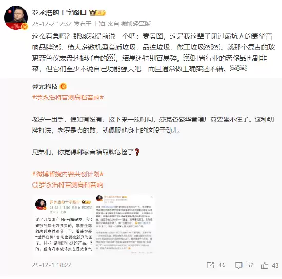 12月2日午间,罗永浩在微博发布了一条针对豪华音响品牌的犀利点评,他表示:“麦景图这个牌子,可以说是我这辈子见过最让人失望的豪华音响品牌了。绝大多数机型音质堪比垃圾,品控更是一塌糊涂,做工也粗糙得不行。唯一看起来还不错的,就是那个复古风格的玻璃蓝色仪表盘,结果呢?偏偏还特别容易碎。”